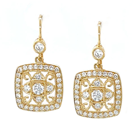 These sparkling drop earrings feature round rubies and diamonds arranged in an elegant yet playful floral pattern and set in 18k yellow gold. The ruby clusters are framed with diamonds for eye-catching sparkle and contrast. They are a perfect size for day or evening, and the design makes them so versatile! Wear them with something casual for a party, or with a black dress for a candlelit dinner! Fun, timeless, and ready to celebrate!
