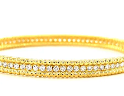 This stunning ring features bright green emerald rounds set in an 18k white and yellow gold band with an elegant combination of hand-applied, Florentine-inspired finishes.