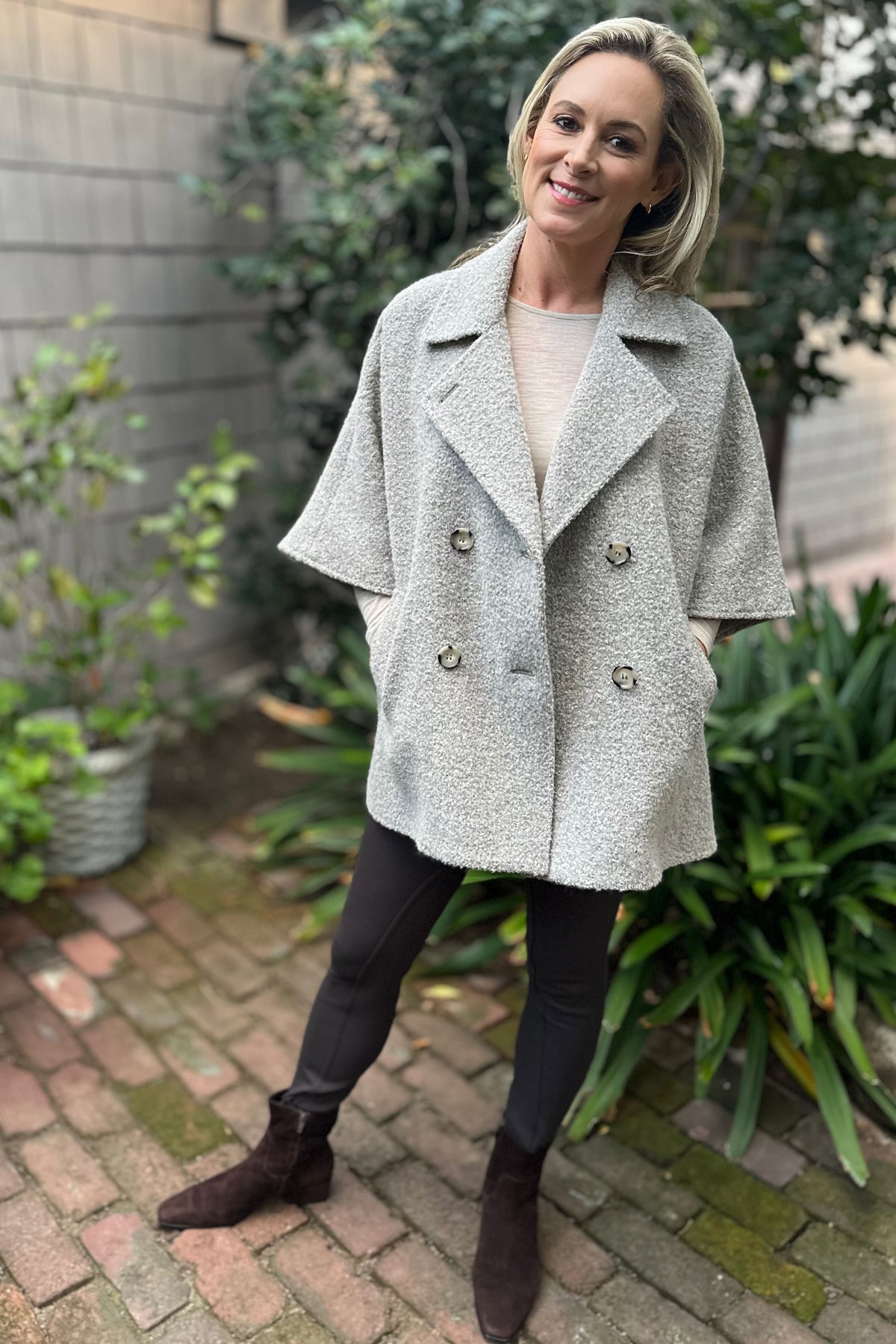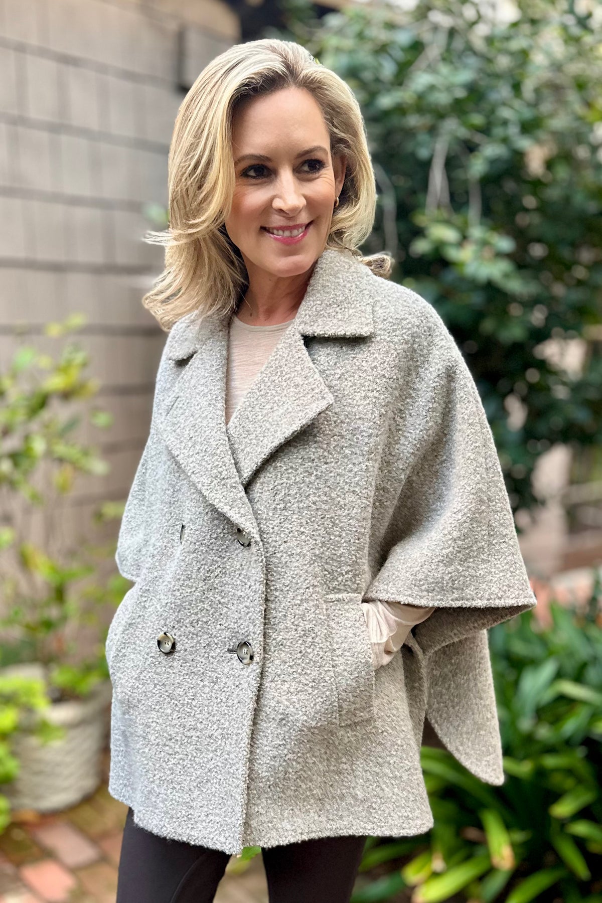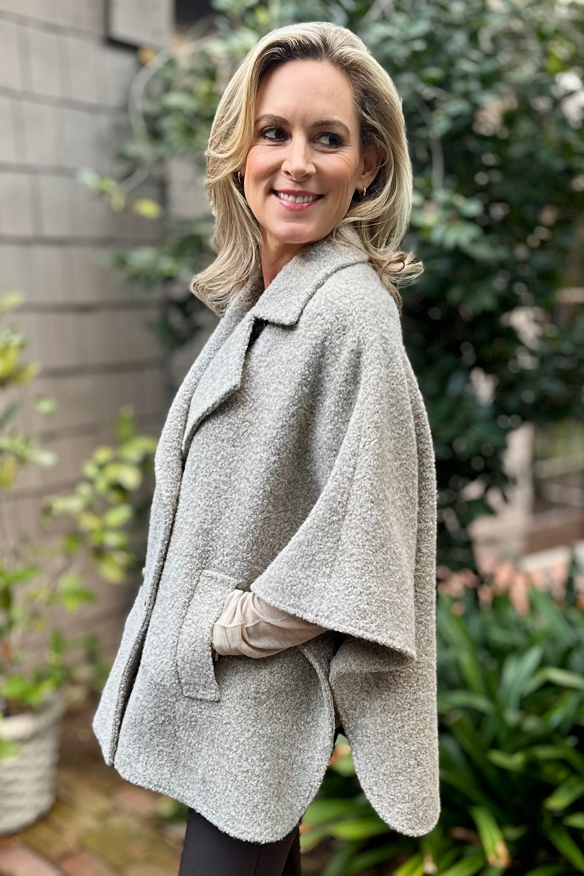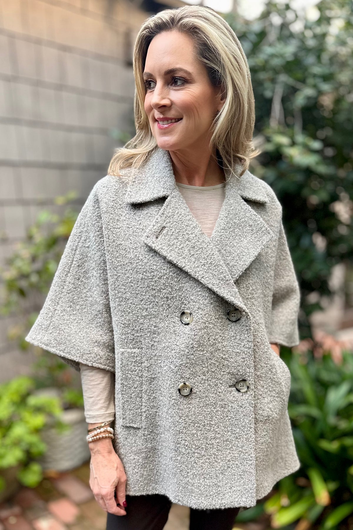Regular price $725.00 Sale price $580.00Capes are timeless and this one by Cinzia Rocca will go with everything. The natural taupe color will match all of your fall staples and give every outfit a lift. The fun boucle fabric adds a touch of texture and warmth.